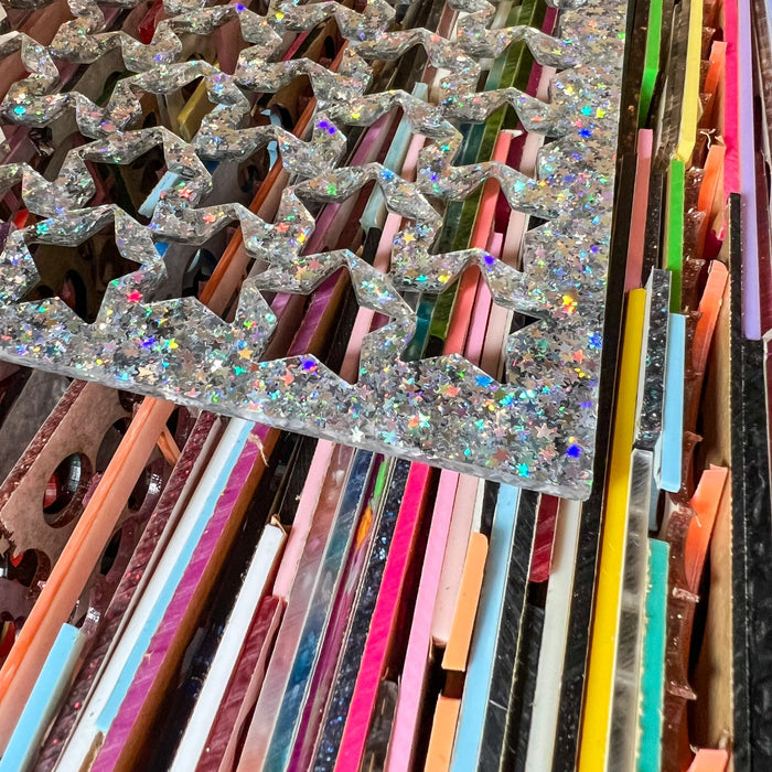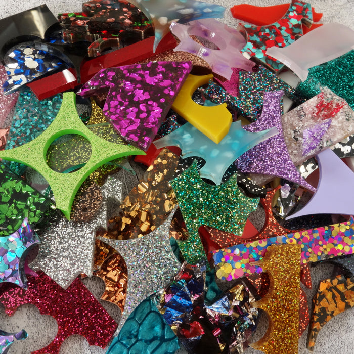 Acrylic offcuts and waste scrap is an inevitable bi-product of the laser cutting process. Jewellery makers laser-cut acrylic shapes from flat sheets of acrylic plastic, and the surrounding acrylic is left behind.