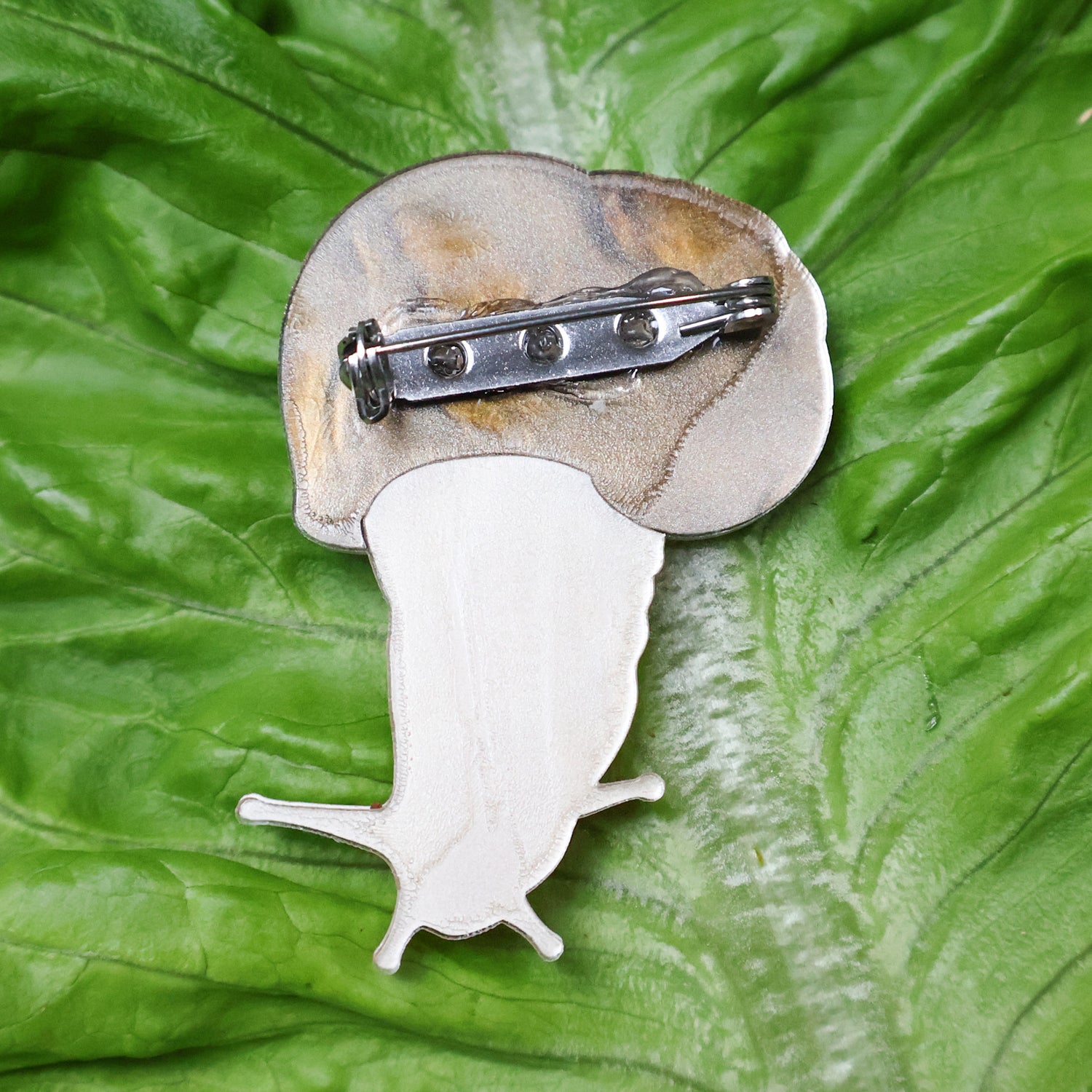 This garden snail is hanging out of its shell in search of some tasty lettuce, in brooch form!