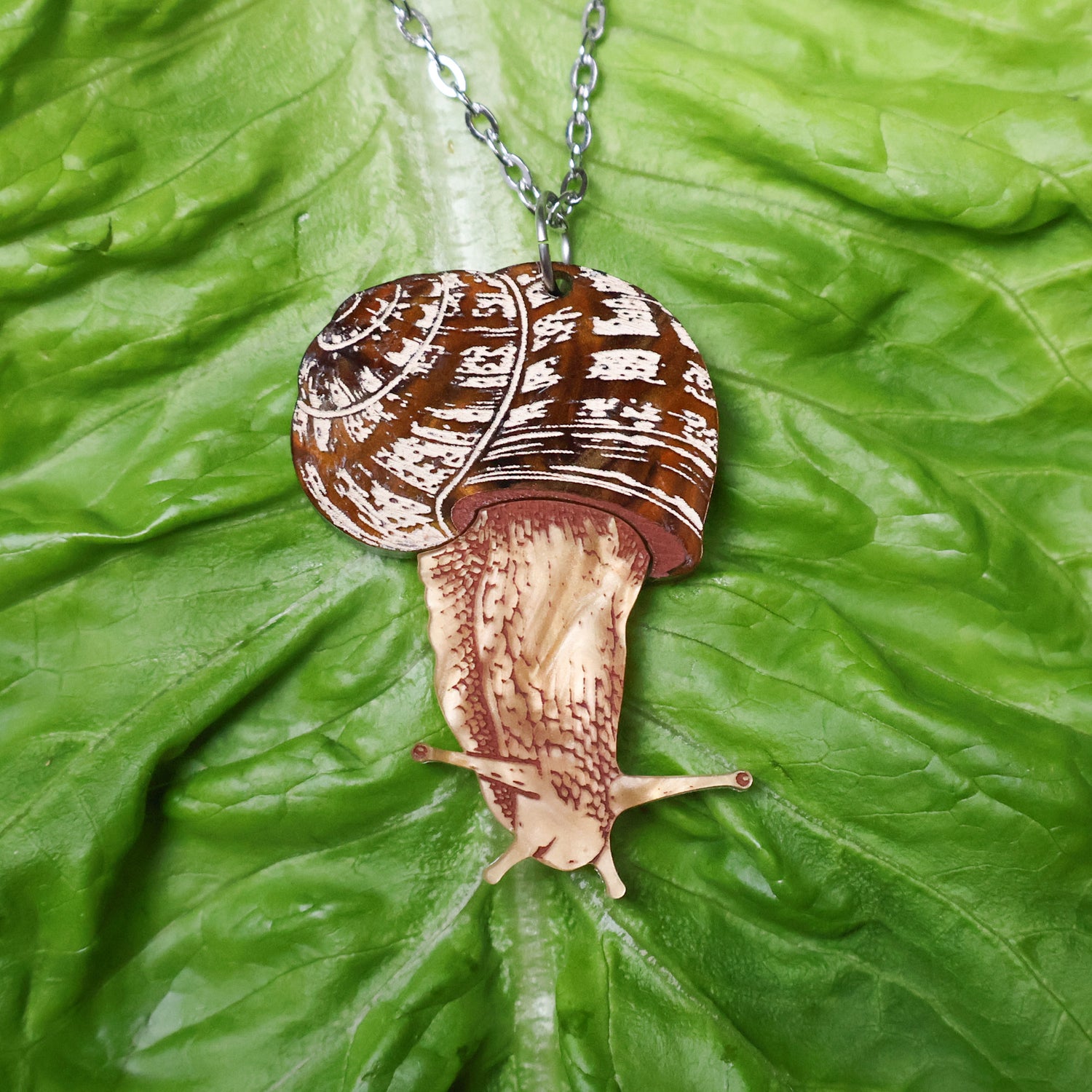 This garden snail is hanging out of its shell in search of some tasty lettuce, in necklace form!